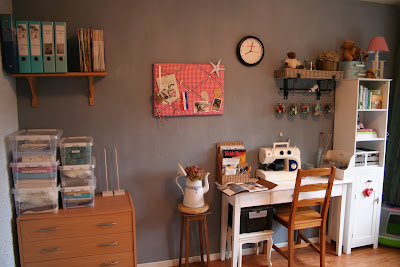 My boyfriend thinks I am acting like a grandma (thank you dear, I am just 34 !!), because I started knitting. I haven't knitted since I was in primary (elementry) school, but I recently started on a cardigan for myself. I found a very nice shop near our village, run by 2 lovely old ladies, who helped me getting started and offered me that I could come back if I needed more help. Watch my blog for updates on the knitting !The craftspace in this room is not big, I don't have many supplies and materials, but I am proud of what I create and also with the space I have now. It is a work in progress, just like the crafting and I know it is no fancy interiordesign, but it works for me and I feel happy with it !